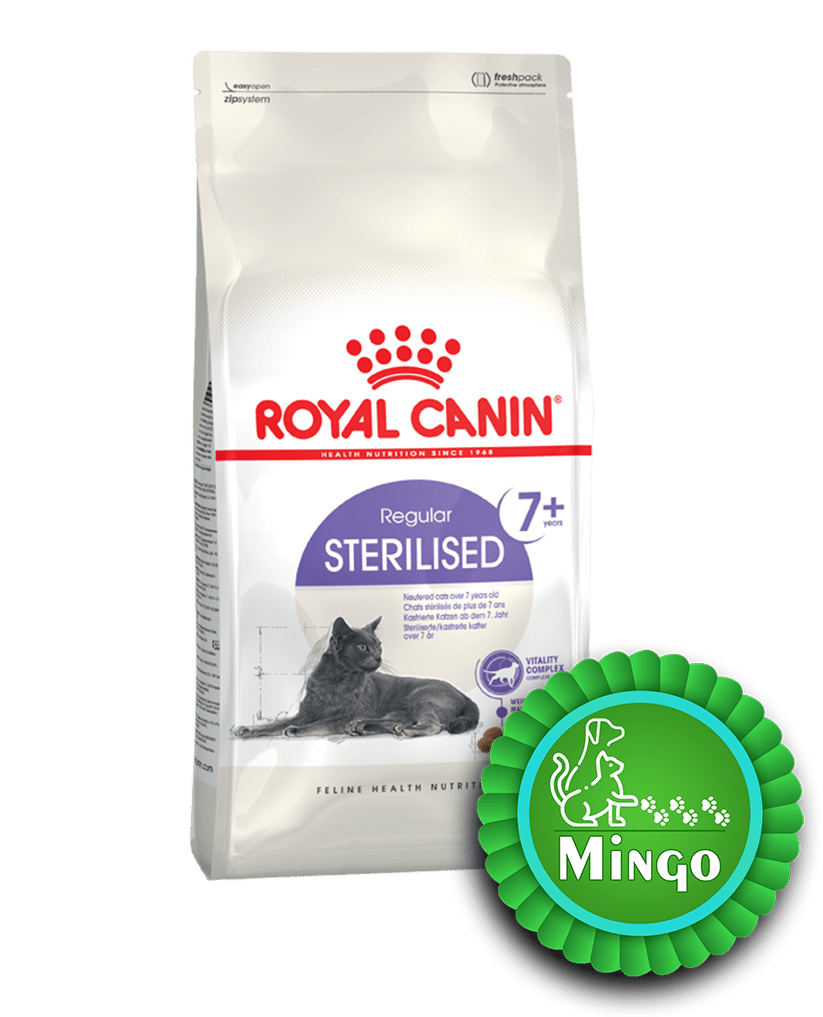 غذای گربه عقیم شده یا Sterilised استریلایزد رویال کنین برای سنین بالای 7 سال تولید شده و از بروز اضافه وزن و مشکلات ادراری پیشگیری می کند.